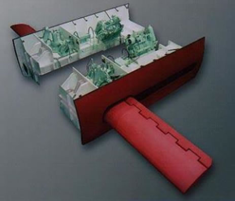 我司研发了具有更好减摇效果的舭龙骨,舭龙骨宽度超过船舯剖面最大边界,在浅水域、停靠码头、补给并靠作业时舭龙骨收起,在深水域或船体周围无船只、海上建筑物时展开舭龙骨,即能提高减摇效果又不易损坏。